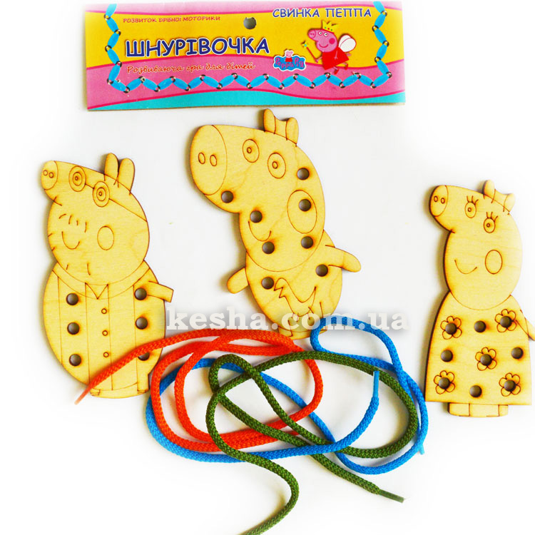 Герої мультфільму в шнуровочці з дерева. У набір входять 3 шнурочки і 3 героя з мультфільму: Джордж, мама Свинка і тато Свин.
